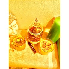 Las dos velas y el bote de cristal de la abundancia con Rollon y semillas Fe la abundancia con velas de polvo de oro lámina de oro piedras polvo dorado vainilla y más ingredientes para conservar la buena suerte junto todo 110 euros las velas cada una 10,50 y el Rollon solo 4,30